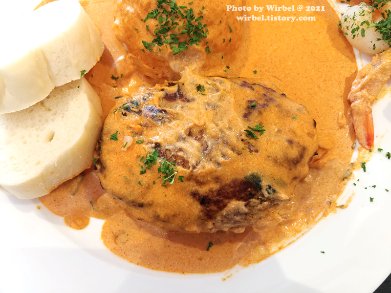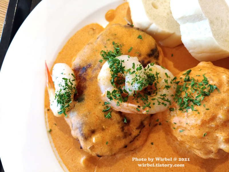 함박스테이크, 새우, 밥, 빵이 나옵니다.