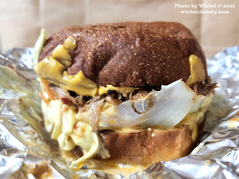 훈제 한 풀드포크, 직접 만든 연유번, 양상추, 코울슬로 슬라이스 치즈.
