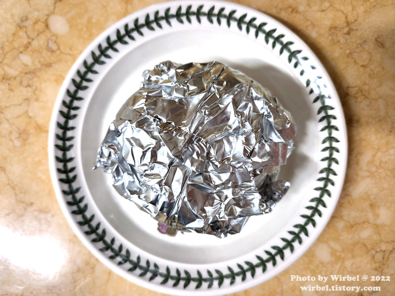 버거는 알루미늄 포일에 쌓여 있습니다.