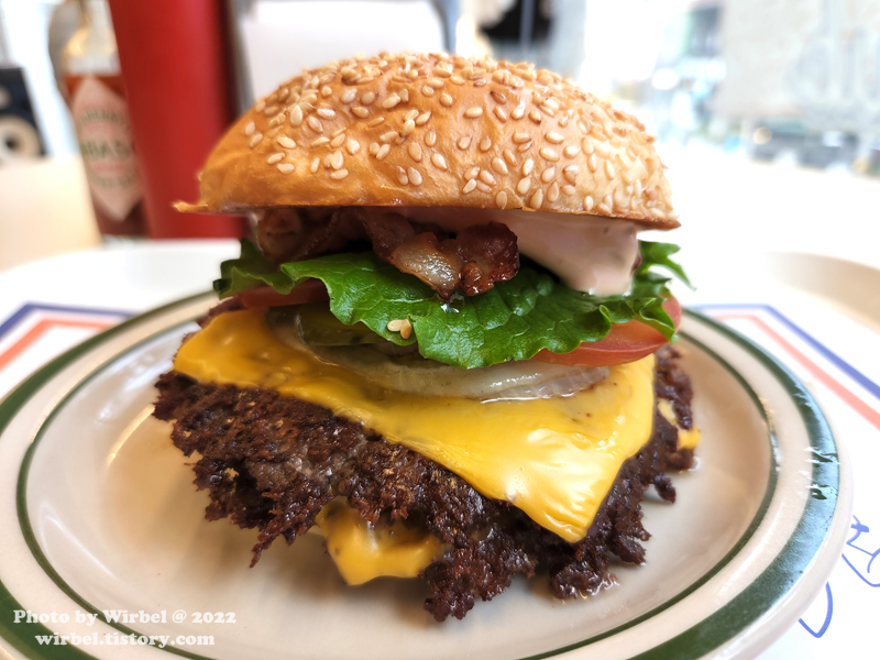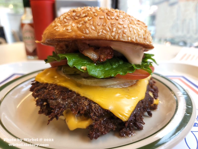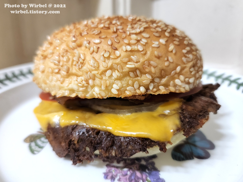 소고기 패티를 두 장으로 했는데 이미 한 몸으로 된 것처럼 붙었습니다.
