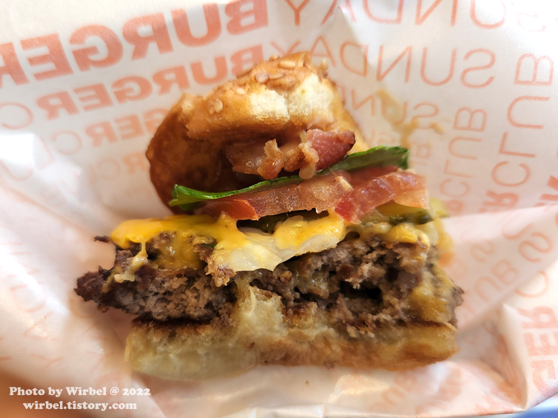 소고기 패티, 아메리칸 치즈, 구운 양파, 피클, 토마토, 로메인, 베이컨, 선데이 소스.