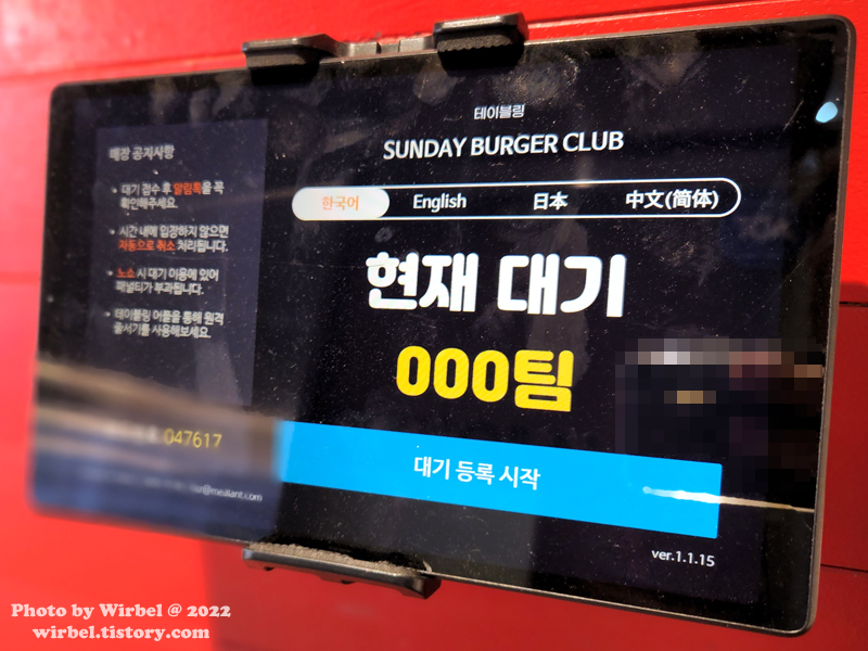 압구정 줄서는식당 선데이버거클럽 웨이팅 시스템으로 테이블링(Tabling)을 사용하고 있습니다.