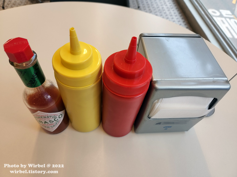 테이블에는 타바스코 소스, 머스터드 소스, 케첩이 있습니다.