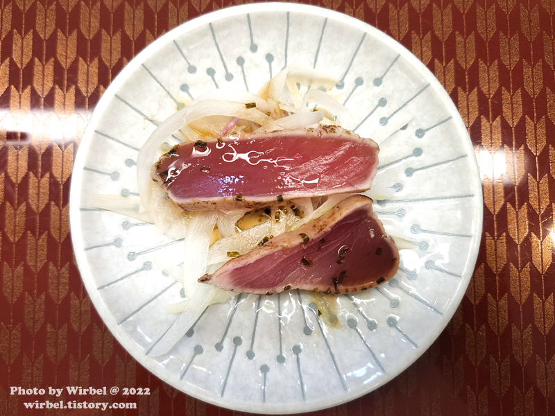 참치타다끼는 양파와 와사비간장이 곁들여져서 나옵니다.