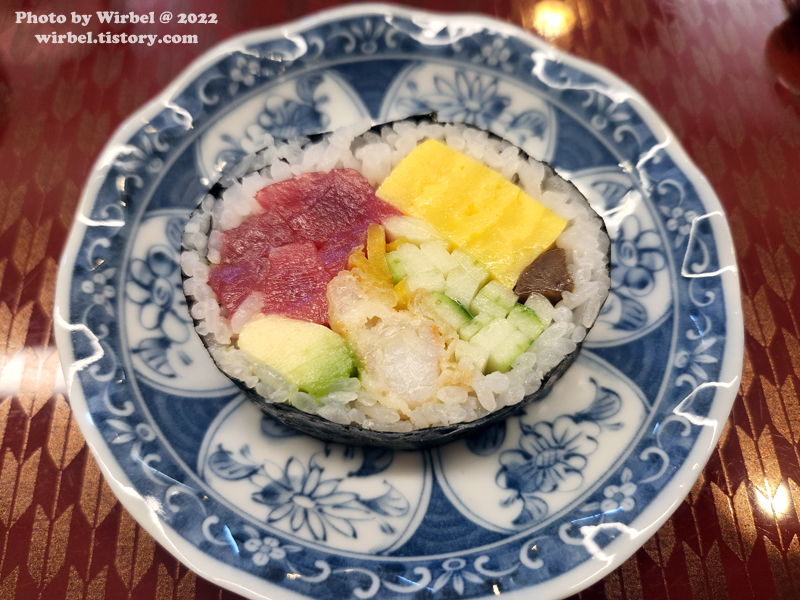 참치, 아보카도, 새우튀김, 오이, 달걀말이가 들어간 후토마키입니다.