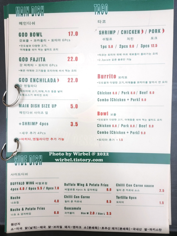 한줄평: 가족과 함께 방문해서 반응이 괜찮았던 멕시칸 음식점! 방문 시기: 2022년 6월 이날 가격: 43,500원 시그니처 메뉴: 화이타 재방문의사: 웨이팅이 적을 때 |
