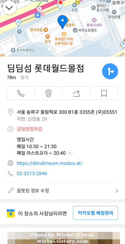 상호: 딤딤섬 롯데월드몰점 / 點點心 / Dimdimsum 전화번호: 10:30 ~ ??:?? (영업시간 애매함) 영업시간: (롯데월드몰 영업일과 동일) 주소: 서울 송파구 올림픽로 300 롯데월드몰 지하 1층층 (서울 송파구 신천동 29 롯데월드몰 지하 1층) 주차: 주차 가능 (롯데월드타워 정책에 따름) 딤딤섬 홈페이지: https://dimdimsum.modoo.at/ 딤딤섬 인스타그램: https://www.instagram.com/dimdimsumkr/ |