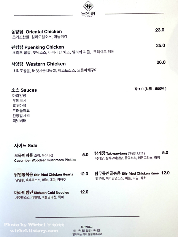 남영탉 동양탉이 대표 메뉴인데 서양탉이 어떤 맛일지 상상이 안 되어서 주문합니다.