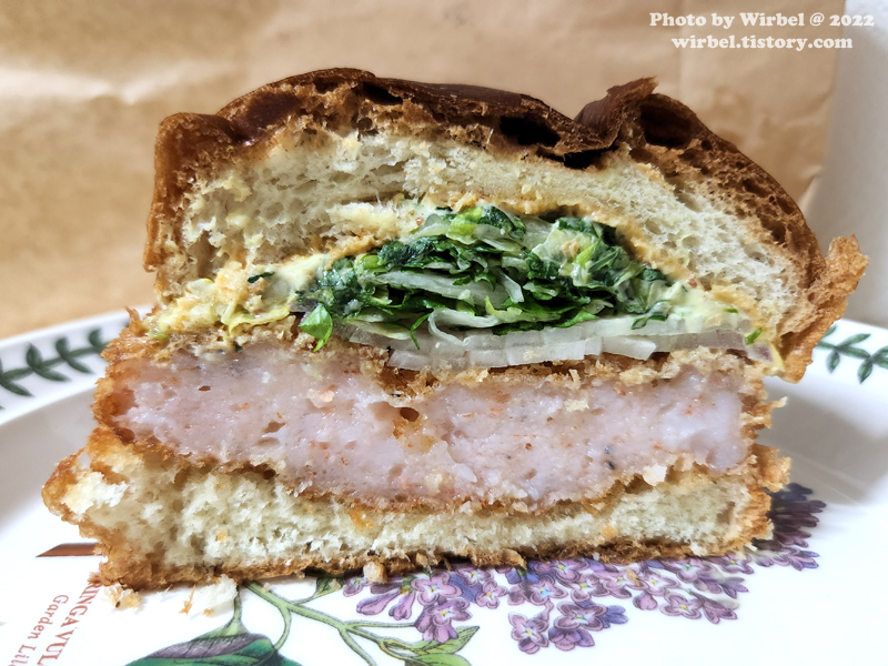 잘 구워진 번 사이에는 새우튀김패티, 적양파, 양상추와 로메인, 와사비 소스, 제스티 소스가 차곡차곡 쌓여 있습니다.