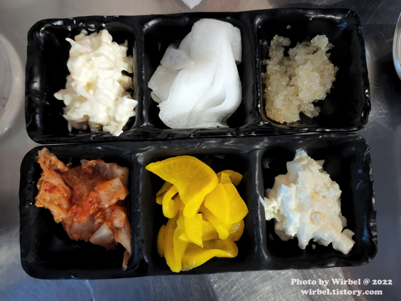 밑반찬 김치, 단무지, 샐러드.