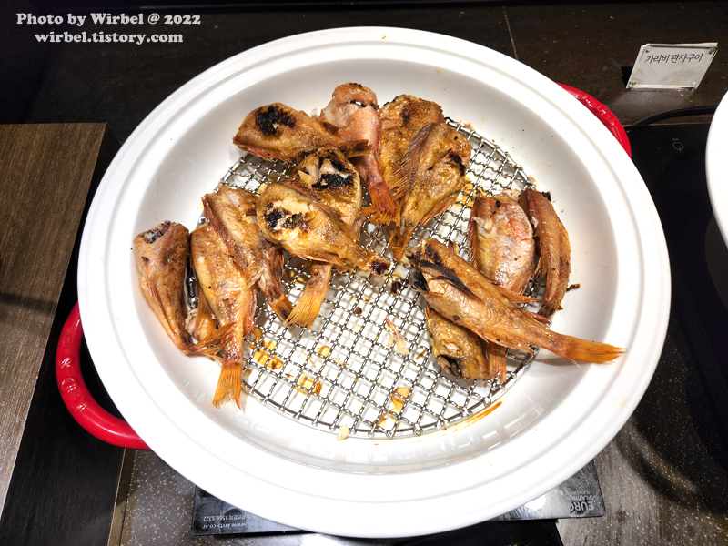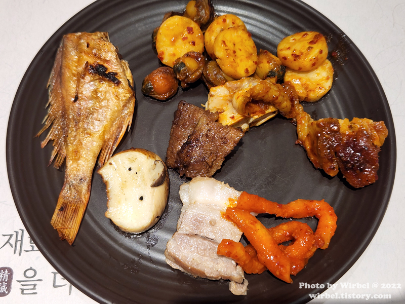 생선구이, 버섯, 보쌈, 돼지고기양념구이, 치킨스테이크, 매콤한 가리비 관자구이.