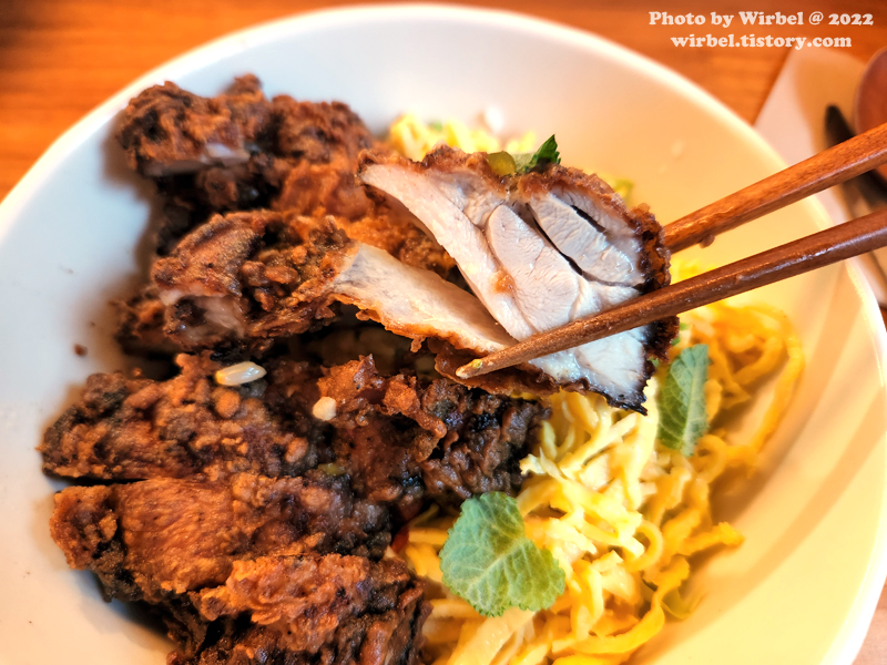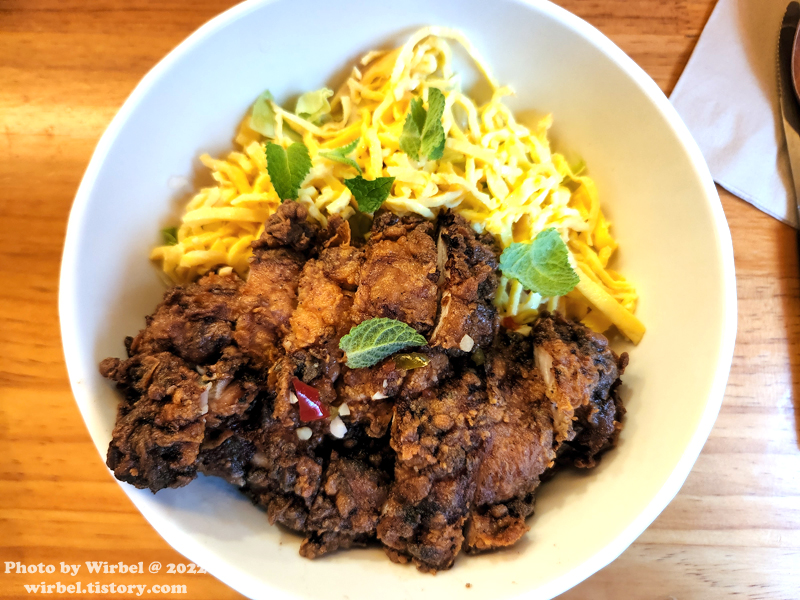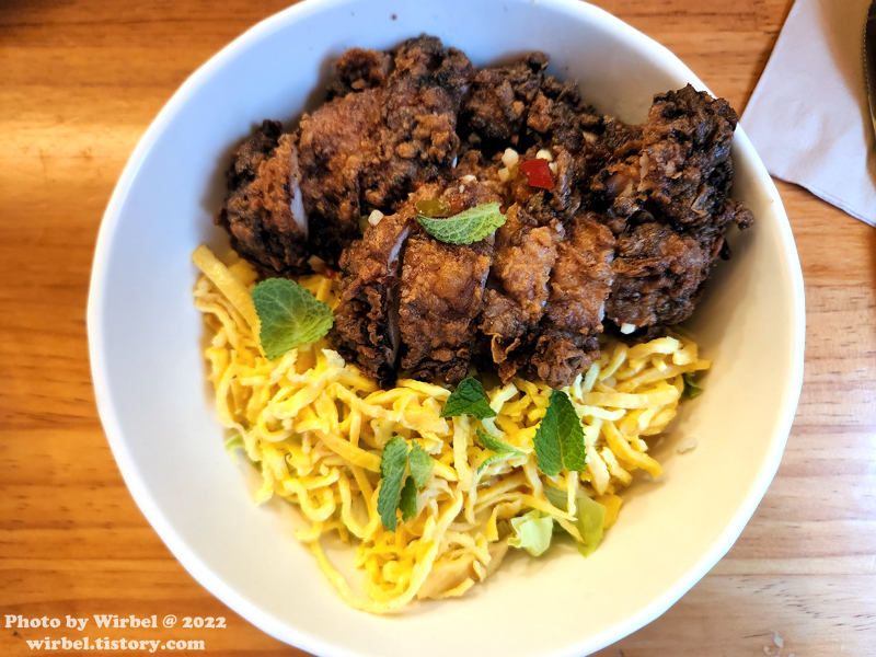 바삭하게 튀긴 치킨과 느억맘 소스, 계란지단, 민트, 스리라차 마요.