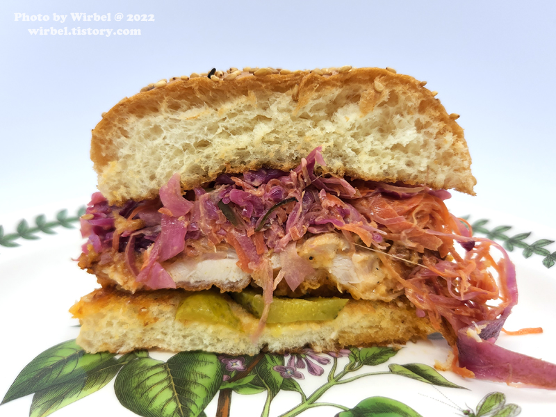 밀크번 사이에 딜 피클, 치킨, 코울슬로가 차곡차곡 쌓여 있습니다.