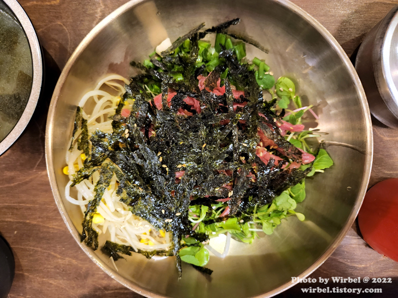 육회비빔밥은 채소와 콩나물 등이 들어가는데 메뉴판의 사진과 많이 다르군요.