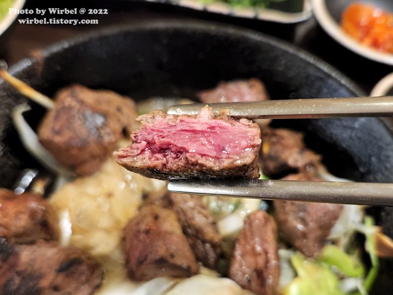 요즘 스테이크 덮밥에서 많이 볼 수 있는 큐브 스테이크입니다.