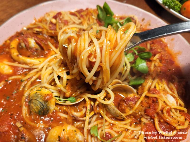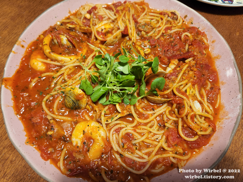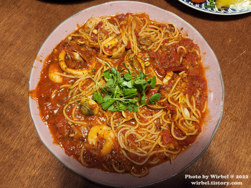 <해산물 토마토 스파게티 / Seafood Tomato Spaghetti> 하프, 가격: 11,900원.