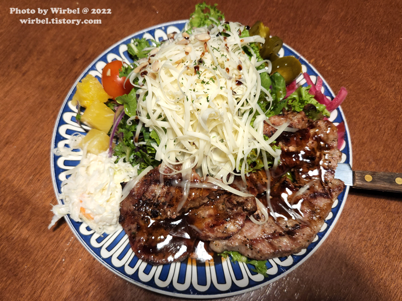 원플레이트하면 가장 먼저 떠오르는 목살 스테이크 샐러드입니다.