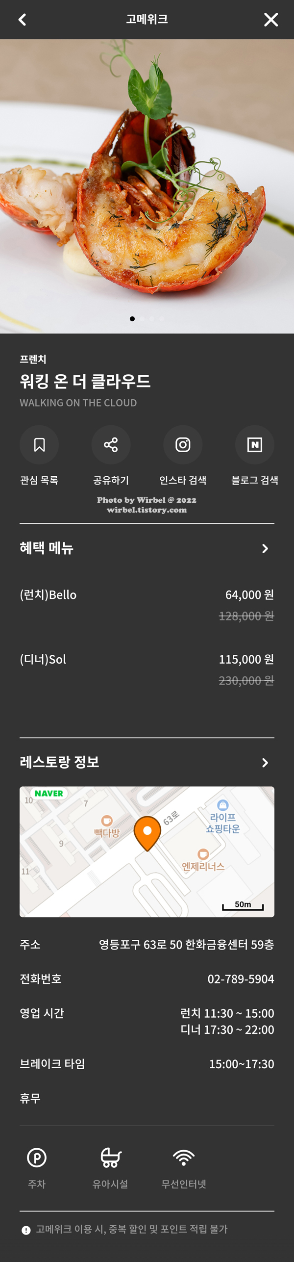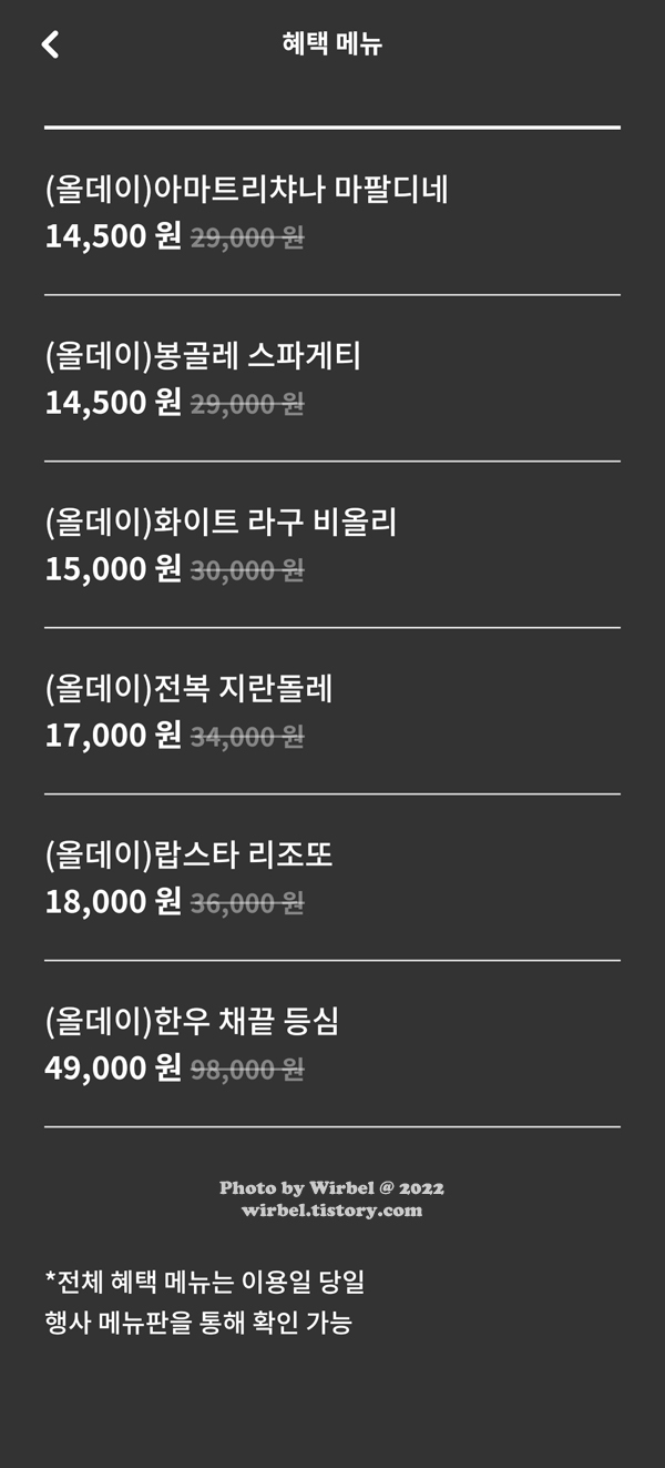 현대카드 고메위크 레스토랑 메뉴 가격 정보.