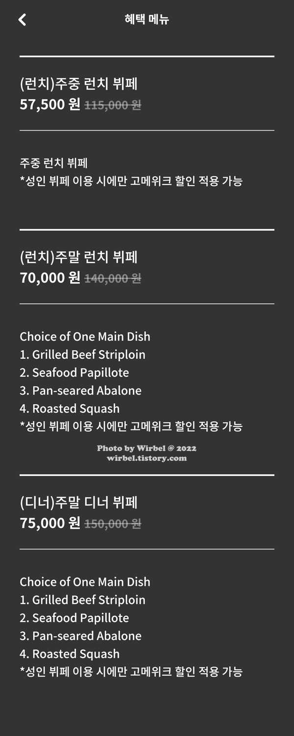 시청역 웨스틴조선서울 루브리카 고메위크 메뉴 가격.