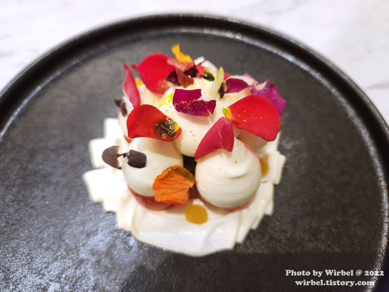 대추 토마토, 부라타, 토마토 젤리, 바질 샤벳.