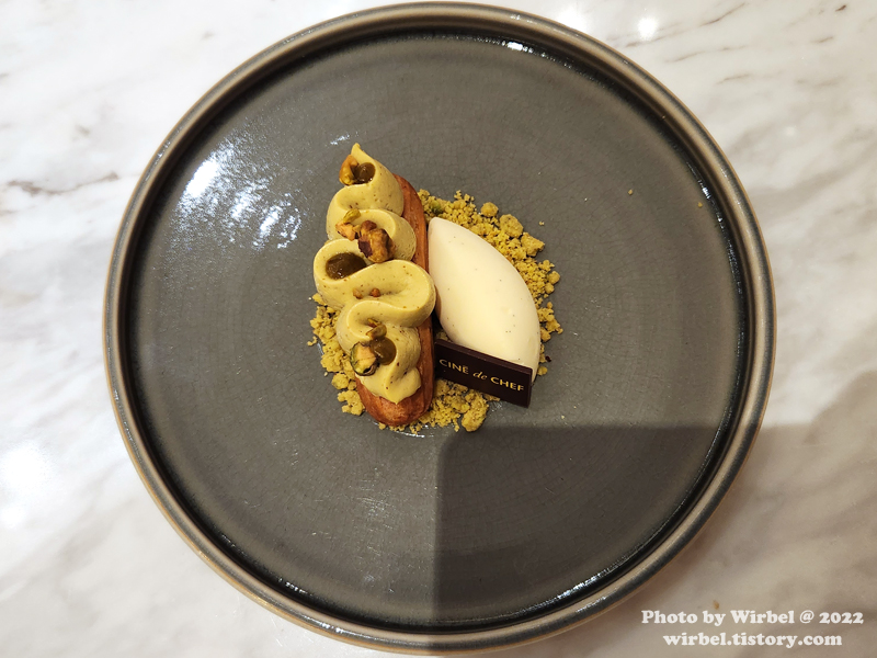 에끌레어 위에 피스타치오 크림(?)과 프랄린(?)이 얹어져서 나옵니다.