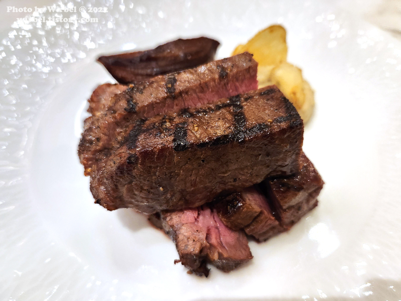잘 구워진 안심 스테이크가 두 덩이로 나옵니다.