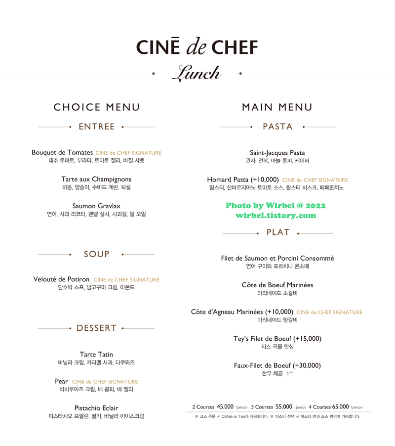 압구정 씨네드쉐프 런치 코스 메뉴.