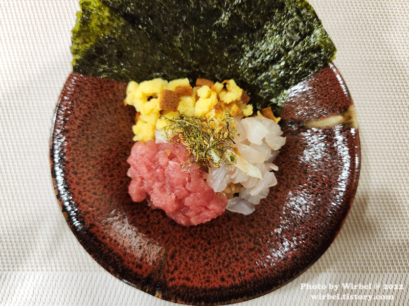 기름지기 때문에 취향껏 와사비를 더 많이 넣어 먹어도 되지만