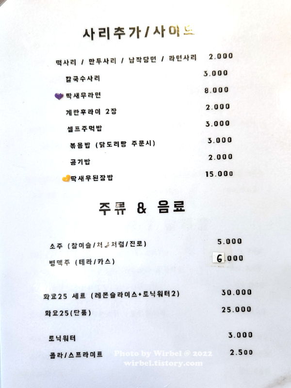 새우닭 사리추가 메뉴 가격.