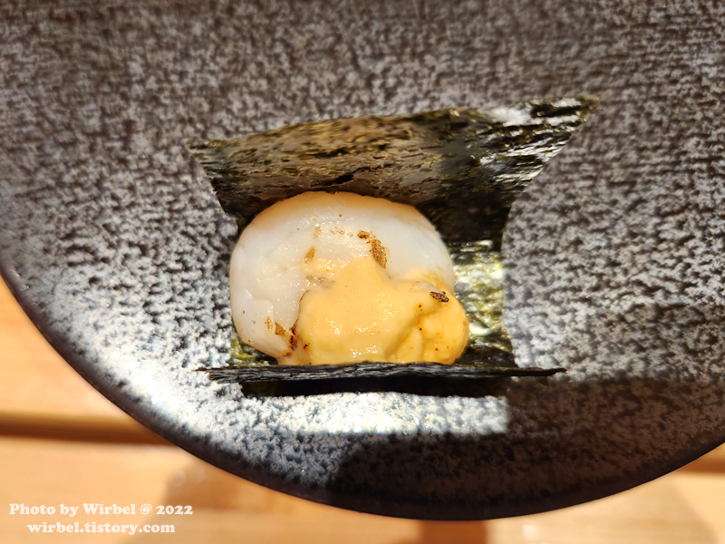 관자와 우니 소스가 만나니 맛이 없을 수가 없지요.