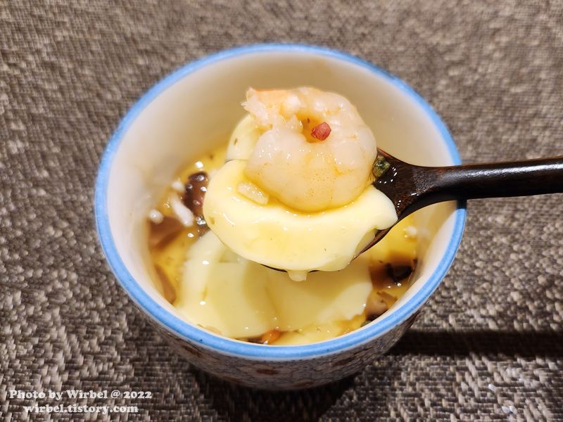 달걀찜에는 새우 한 마리가 얹어지고 찹쌀튀김과 표고 다진 것이 곁들여집니다.