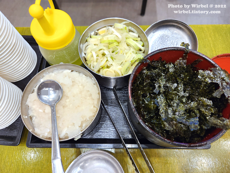 테이블에는 판메밀 쯔유에 담아 먹을 김가루, 무즙, 파가 있습니다.