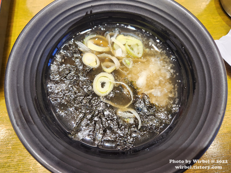 육수에는 김가루, 무즙, 파, 와사비를 취향껏 넣습니다.