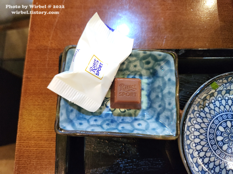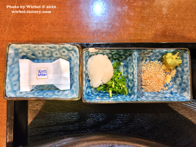 후식 초콜릿, 무즙, 송송파, 깨소금, 간생강, 와사비.