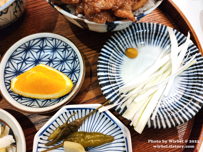 후식 귤, 부타동에 곁들일 겨자 소스와 파채.