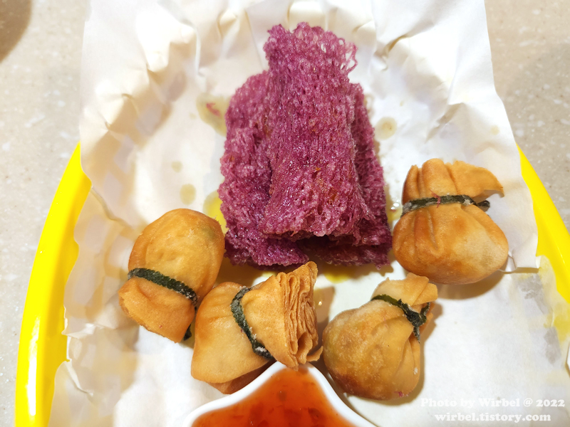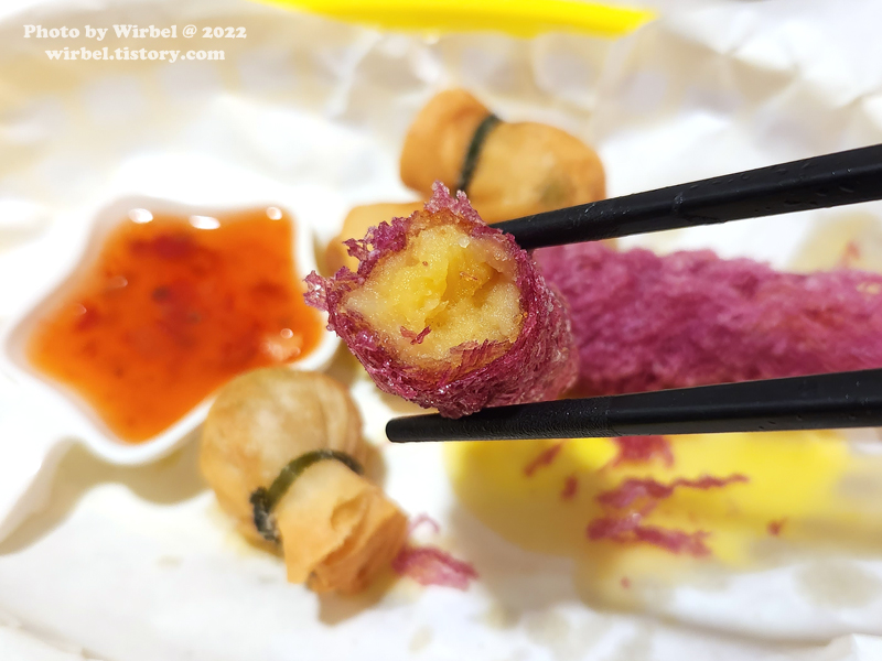 자주색 튀김옷 안에는 고구마가 들어 있습니다.