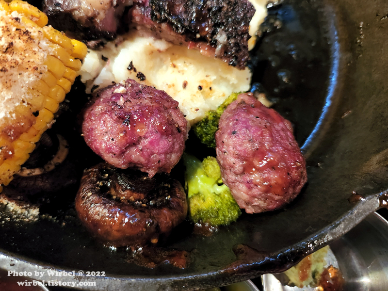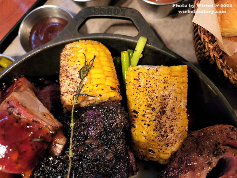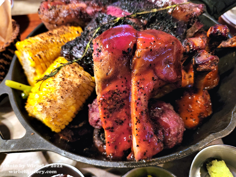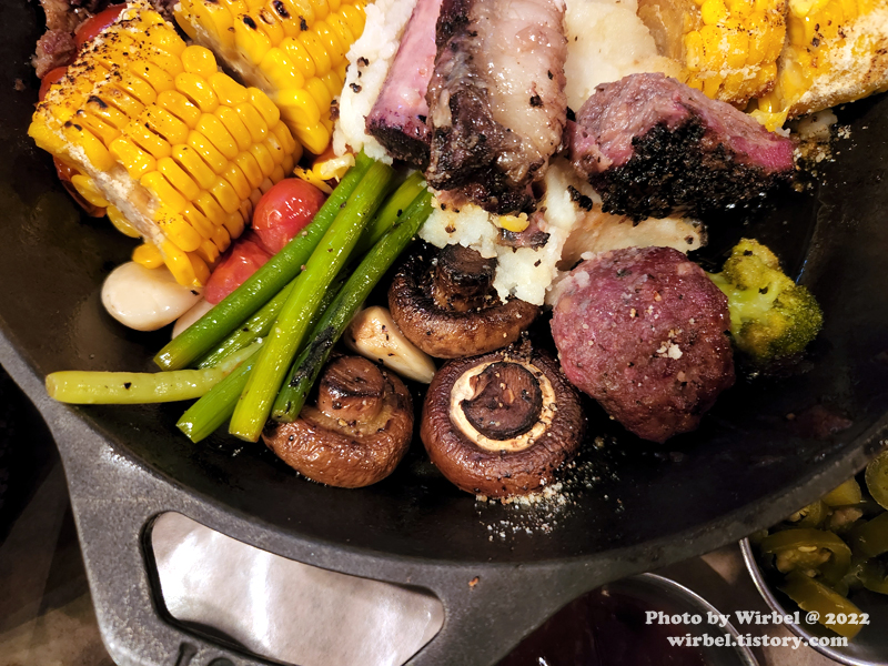 차돌양지 + 꽃갈비 + 찹 브리스킷 + 치킨 롤리팝 + 비프볼 + 구운 야채 + 구운 옥수수 + 매쉬 포테이토.