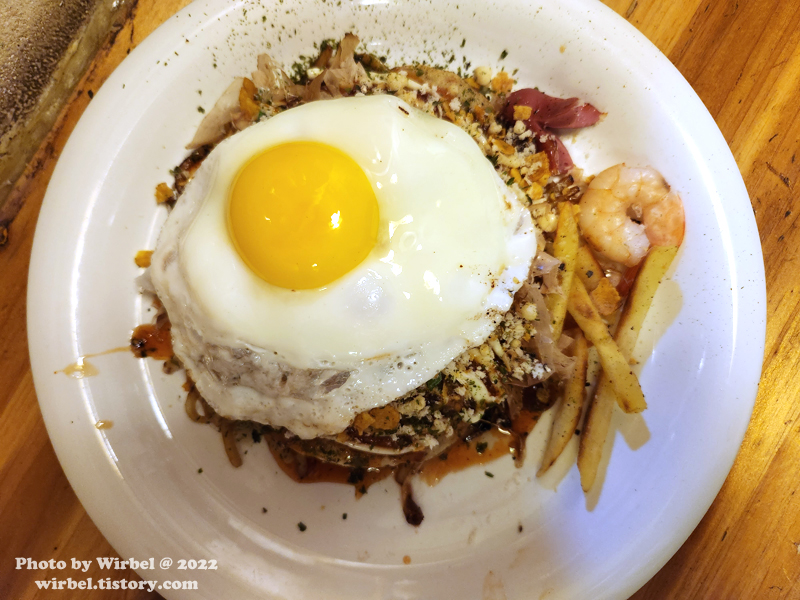 토핑으로 써니사이드업 달걀프라이가 나오고 새우, 감자튀김, 비엔나 소시지가 사이드로 나옵니다.