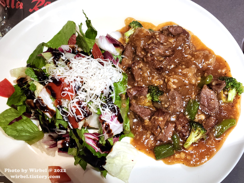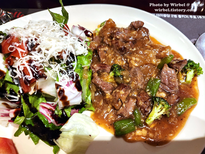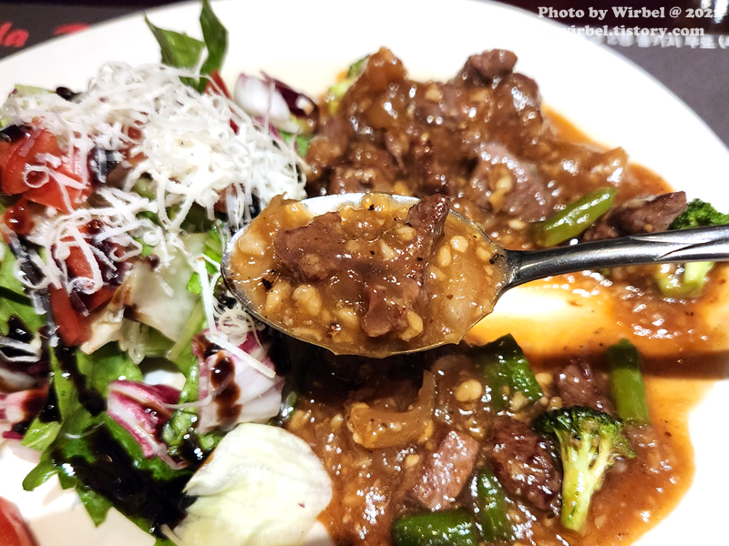 프라임 부채살에 튀긴 양파와 꽈리고추를 넣은 소스와 데리야끼 소스로 볶아낸 요리라고 합니다.