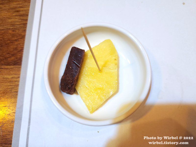 후식으로 양갱과 파인애플을 먹으면서 식사를 마무리합니다.
