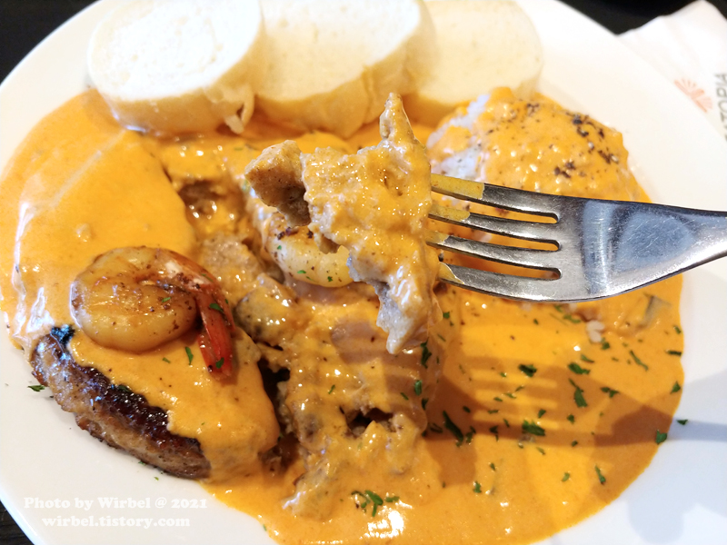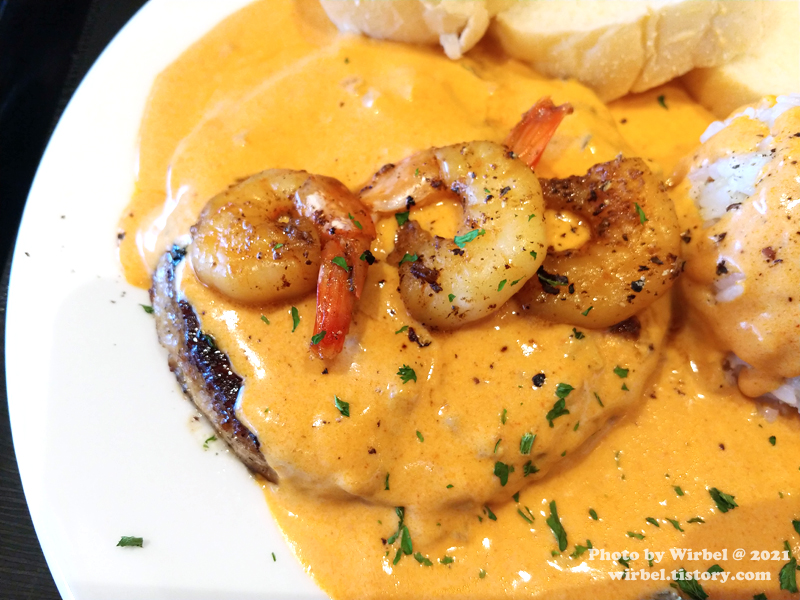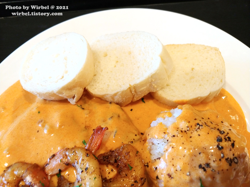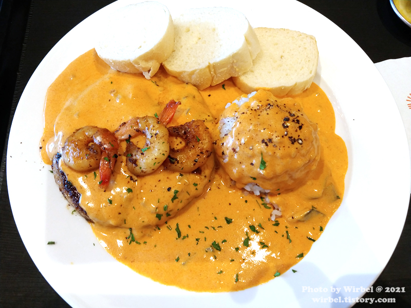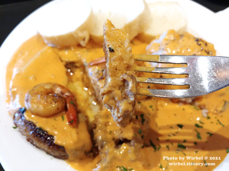 매콤한 맛과 새우의 감칠맛이 도는 한국식 크림소스 스테이크.