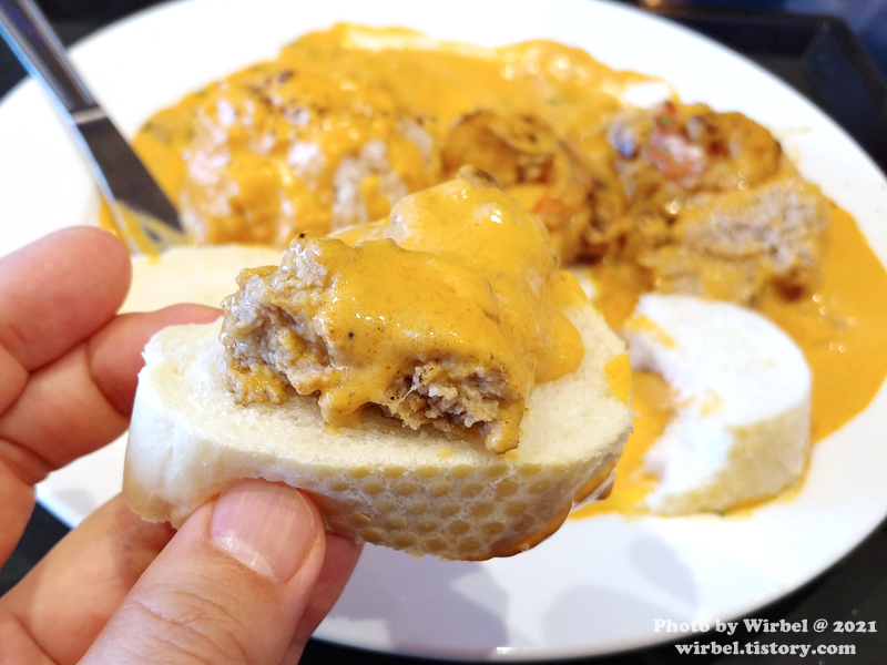 빵을 소스에 찍어 먹어도 되고 타파스처럼 함박스테이크를 얹어서 먹어도 됩니다.