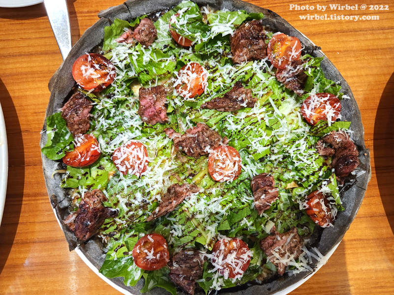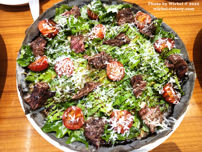 오징어 먹물을 이용한 도우에 그릴에 구운 스테이크와 로메인, 방울토마토,