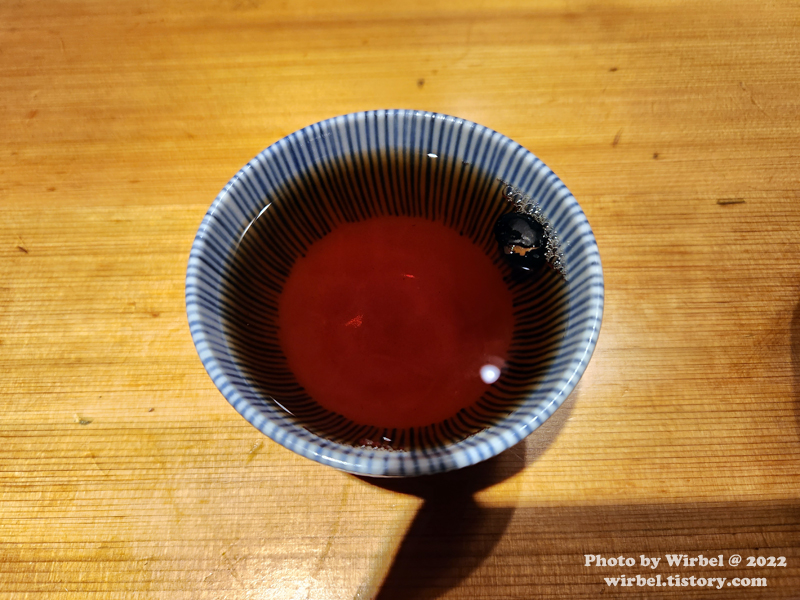 밥을 어느 정도 먹고 있으면 셰프님이 오차즈케처럼 남은 밥을 말아먹으라고 육수, 와사비, 파를 줍니다.