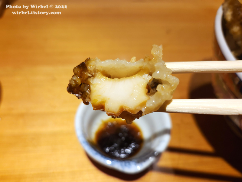 텐동에 찍어 먹을 소스를 같이 줘서 전복 튀김에 살짝 겨들여 먹어봅니다.