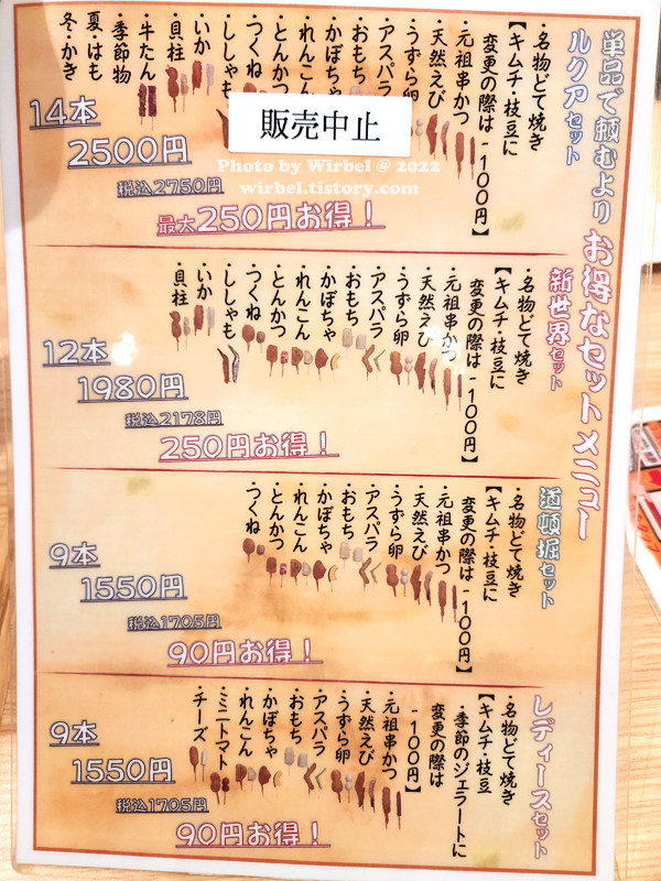 오사카 쿠시카츠 맛집 쿠시카츠다루마 세트 메뉴 가격.