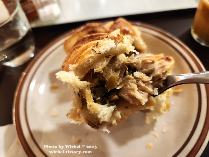 크리미한 소스에 양송이버섯과 치킨이 듬뿍 들어간 미트 파이라고 합니다.