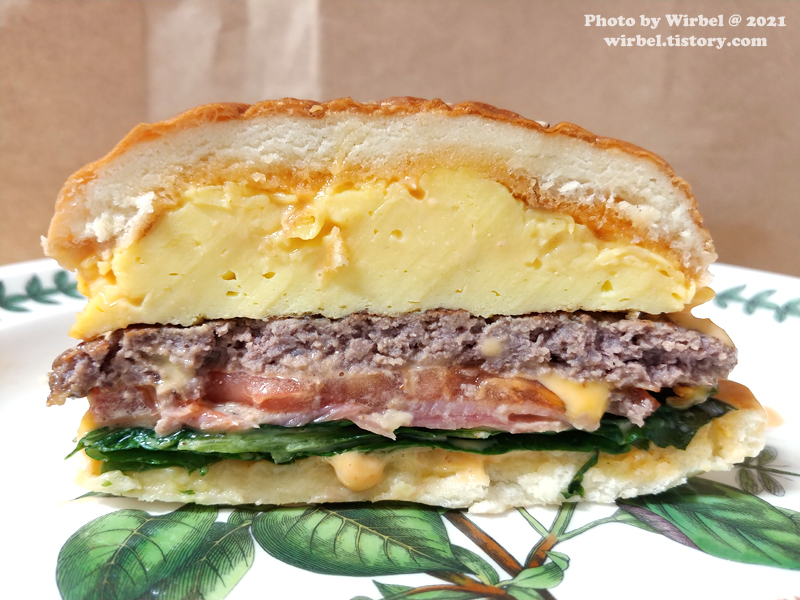 번, 로메인, 베이컨, 토마토, 치즈, 소고기 패티, 에그 스크램블, 지못미 소스가 차곡차곡 있습니다.