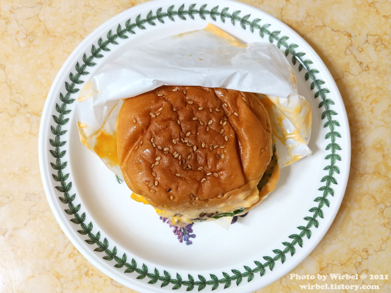 에그 스크램블과 살짝 매콤한 소스가 어우러지는 버거입니다. 츄릅~~