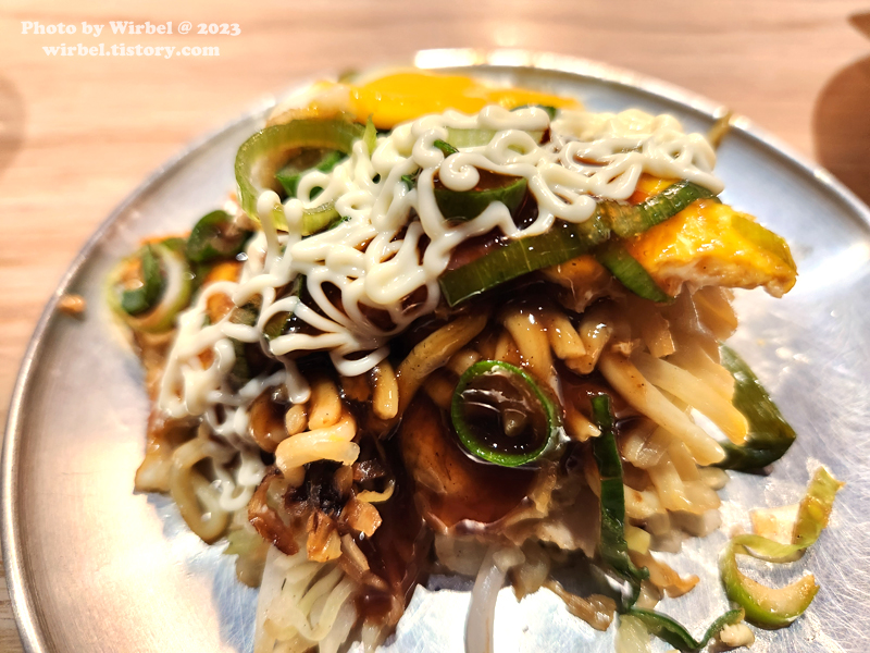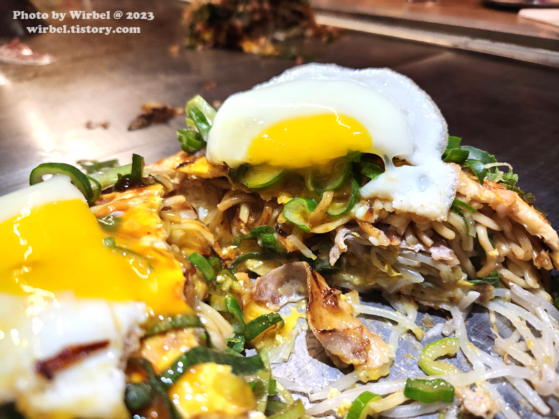 핫쵸 오코노미야키는 오사카 오코노미야키 스타일이 아니니 히로시마 오코노미야키 스타일입니다.
